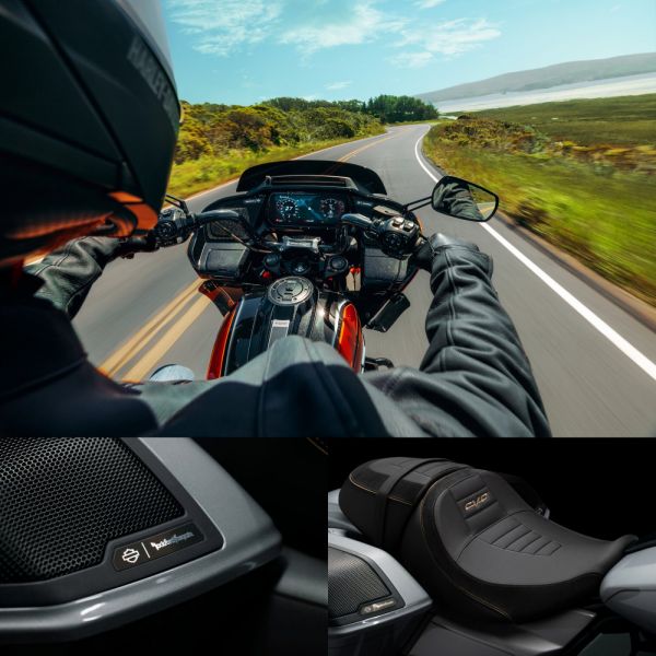 Az idomzat mellett a műszeregység sem átlagos, a Harley 12,3 colos, óriáskijelzővel váltotta fel az analóg műszereket. Nem csak egyszerűen egy gigászi monitorról van szó, a 3 különböző nézetet felvonultató érintésérzékeny felület (kesztyűben is használható) a BMW top túragépeihez hasonlóan nagyban tudja mutatni a térképet. A tudása sem átlagos, hiszen Apple CarPlay-t futhat rajta, illetve kapunyitó rendszerrel is lehet párosítani – nem kell elővenni a távirányítót, egyszerűen a műszeregységről vezérelhetjük a garázskaput. A márkától megszoktuk azt is, hogy a nagy túramotoroknál komoly hangsúlyt fektetnek az audiorendszerre, ennek jegyében a Rockford Fosgate csúcskategóriás terméke felel az élményért. Még a koff erek fedelében is találunk hangszórókat!