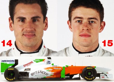 A Force India kifejezetten gyengének tűnt az előszezoni teszteken, ráadásul a túlmelegedés és más hasonló, megszokott gyerekbetegségek mellett akadt néhány különös problémájuk is a felkészülés során, például amikor Paul di Resta (15) Barcelonában a beragadó gázpedál miatt végezte a kavicságyban. Mindez tovább erősítette azt a gyanút, hogy az istálló nem tudta kiheverni a Sauberhez tavaly távozó technikai igazgató, James Key elvesztését, s így nem lesz képes folytatni az elmúlt három évben töretlen menetelését sem a rajtrács eleje felé, legyen bármilyen gyors Adrian Sutil (14).