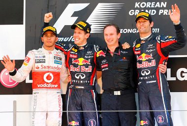 Sebastian Vettel revansot vett az elvesztett japán győzelemért, s megmutatta, hogy ha nem a világbajnoki cím a tét, akkor leigázza a mezőnyt. Az újdonsült kétszeres Forma-1-es világbajnok hatalmas fölénnyel megnyerte ugyanis a Koreai Nagydíjat, így egy újabb helyszínt is begyűjtött a győzelmi kollekciójába. Mivel csapattársa, Mark Webber a dobogó harmadik fokára állhatott fel, a Red Bull begyűjtötte a távol-keleti pályán a konstruktőri világbajnoki címet. Az ezüstérmes helyen a nem túl elégedett Lewis Hamilton ért célba.