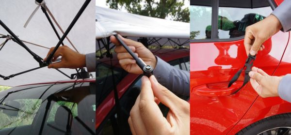 A gyártó szerint 60 km/órás szélsebességig nincs gond, de tájfunt is túlélt már az autóesernyő – a ponyvát elfújta a szél, de ezt követően még a fényezés se karcolódott, hiszen a pálcákba nem tud belekapni a vihar. Kapcsos pántokkal lehet a külső tükrökhöz és a kilincsekhez rögzíteni a rudazatot, de az ajtónyíláson is át lehet húzni ezeket, a lopásvédelmet jelentő acélsodronyt tartalmazó pántot is így, az ajtóval odacsukva kell rögzíteni.