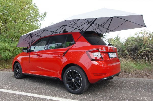 Nem is annyira az esőtől óv az autóesernyő, hanem árnyékoló – nyáron akár 30 fokkal alacsonyabb az utastér hőmérséklete –, illetve a hótól, jégtől (jégeső) tisztán tartja az ablakfelületeket. Ráadásként feliratozni is lehet, azaz reklámhordozóként is használható; amíg a Škoda Fabiáról hátrafelé lelóg a ponyva, egy kombi vagy lépcsős hátú esetén már nincs ilyen, az esetleges gyalogosokat veszélyeztető túlnyúlás. A 149 900 Ft-os árból 2018 folyamán 12%-ot engednek, ezen felül még különféle kuponos kedvezményeket is lehet érvényesíteni, így 131 990 Ft a vételár. Raktárról szállítanak, s a termékekre egy év garanciát vállalnak.