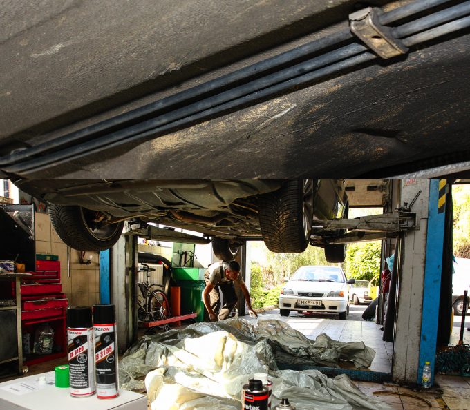 Előkerültek hát a klasszikus alvázvédők. Ilyen is készül műhely kiszerelésben, amelyet pisztollyal, vagy ha tubusos, akkor kartuspisztollyal kell felvinni. Az ilyen szervizmódszerek előnye, hogy nagy anyagvastagságot lehet viszonylag gyorsan nagy felületre felhordani. Ilyen igényünk nem volt, mert a házi praktikák lehetőségeit kerestük, így ezen anyagok „vékonyabb”, azaz folyékonyabb, kevésbé sűrű, spray kiszerelésű változatait fújtuk a kocsi hasának sérüléseire, és rá a fehér foltként maradt viaszalapú bemutató felületre. Sprayből kétféle töltetűt választottunk, az egyik a klasszikus kaucsuk-bitumen töltetű, a másik típus friss fejlesztésű gumi-gyanta összetételű. A felhordás előtt portalanítottuk a felületet, alapozni nem kellett, mert fémig sehol sem hatolt a horzsolás. A tisztítás után ment fel az anyag, s nem láttunk különbséget régi és új között, mindkettő szépen fedte a felületet, maradéktalanul feltapadt, nem cseppent és gyorsan száradt. A konkrét sérülésekre fújtunk a klasszikus bitumenes anyagból, majd a gumi-gyanta összetételűből az ülések alatti sík, nagy felületű részt fedtük, ami földúton, füves részen a leginkább horzsolódik. Az egész munka az előkészülettel együtt másfél óra alatt kész volt, így bátran ajánlhatjuk olyan autósoknak, akik szeretik a kocsijukat maguk gondozni. Az alvázvédő spray-k gyártótól függően 2500-4000 Ft áron mozognak, alkalmazásukkal pedig nagyságrenddel drágábban javítható hibákat előzhetünk meg.