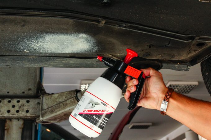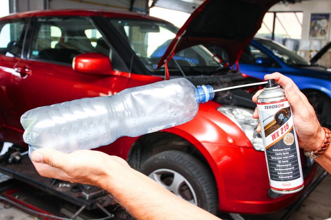 Napi használatban lévő kocsi lett az alany, amely a nyaralások alatt járt földúton, itt-ott ezáltal érintőt vett a talajon. Több felületi horzsolást kivédett a haspajzs, vagy a legalsóbb pontokat jelentő futómű-bekötési pontok, néhányat azonban bevitt a természet. Ez utóbbiak felhorzsolták az alvázvédő réteget, így olyan helyek alakultak ki, amelyek a későbbi korrózió kiindulási pontjaivá válhatnak, ha nem javítják őket. Elsőként egy speciális anyagot és annak ritka fajta felhordó eszközét próbáltuk. A modern autókra jellemző, hogy az aljuk egyre nagyobb részét takarja műanyag borítás. Ezek alatt már az autógyárak sem alkalmaznak vastag alvázvédőt, nincs is rá szükség, mert a mechanikai behatásoktól a műanyag pajzsok védik a fémrészeket. Tehát a burkolatok alá speciális, az üregvédőhöz hasonló fehér, viaszalapú anyagot fejlesztettek kifejezetten a korrózióvédelemre. A gyártó Teroson a felületi terítésre egy, a kertészeti kézi permetezőkre hasonlító pumpás szórópalackot fejlesztett. Ebbe kell tölteni a „viaszt”, pumpálni, majd fújni. A viaszalapú anyag jól tapad, bár nejlonoztunk az autó alatt, de nem csepegett. A kocsira keveset fújtunk, csak bemutatóként, mert itt nem műanyaggal védett területek korrózióvédelme volt a cél.