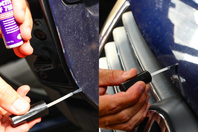 Kőfelverődések elől egyetlen autó sem menekülhet. Alattomos dolog, először alig tűnik fel a hiba, majd a repedt lakk alá beszivárog a víz, és elindul a lemez korróziója. Azonnal cselekedni kell, mert, ha ekkor sem lép a tulajdonos, a korrózió miatt a karosszériaelem cseréjéig is eljuthat. Autósbolti stift lett az első lépés, de nem festékstift. Rozsdagyilkost vetettünk be, ez az anyag a vas-dioxidot vas-trioxiddá alakítja, amely nem rozsdásodik tovább. A végeredmény még korántsem szép: a rozsdaszínű helyett szürke pöttyök sora, viszont a fényezés javításáig megállítottuk a rozsdát. Ugyanezt az ecsetelést elvégeztük egy betonfalra nyitott hátsó ajtóélen is. Itt elég lesz a festék felecsetelés, de a gépháztető megérett egy teljes fújásra.