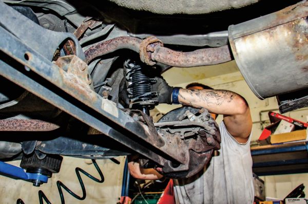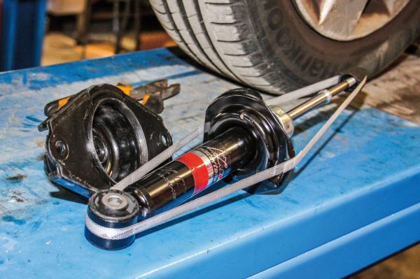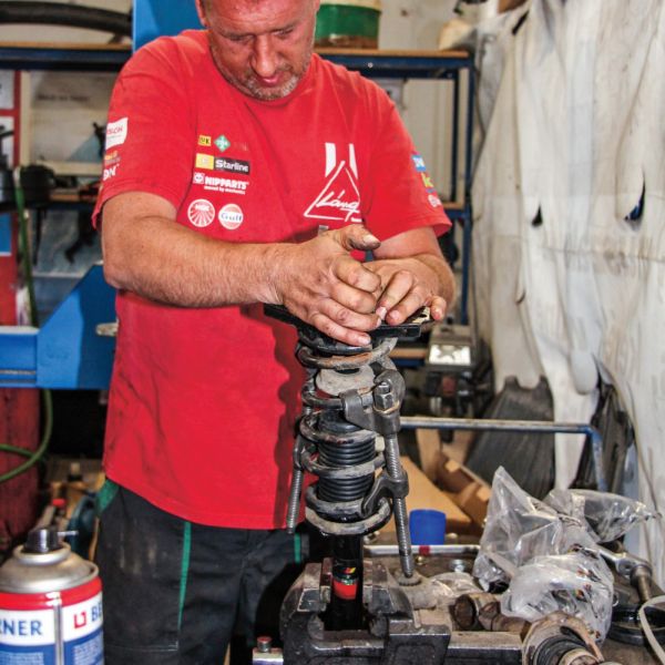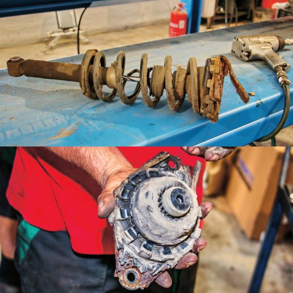 A légkulcs érintésére bőven hullott alá a rozsda. Nem csak a lengéscsillapító volt korrodált, hanem a felső fészek is. A lengéscsillapítóra hegesztett rugótányérokat már csak az imádság tartotta, így szerencséje volt a tulajdonosnak, hogy nem ült le egy nagyobb úthibán az autó. A felső fészekben a gumiszilent is már kővé keményedett és mállott. Természetesen a csavarok sem akartak megindulni… Persze így volt idő rá, hogy megérkezzen az alkatrészfutár az új lengéscsillapítókkal. Ezekre átszerelték a rugókat, az új szilenteket, majd mehettek be a helyükre. Az öreg Almera vélhetően megkapta azokat a lengéscsillapítókat, amelyekkel majd bejut a bontóba, ha fenntartják az eddigi szervizlátogatási ciklusát az autónak.