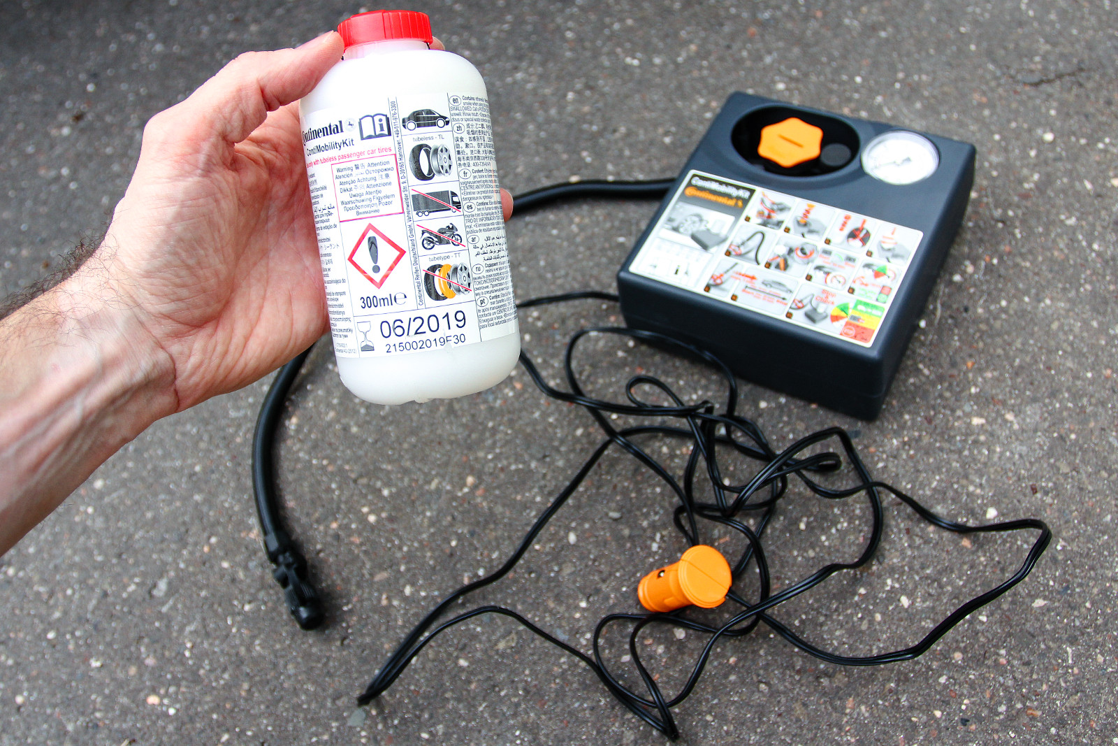 Az autóhoz mellékelt defektjavító készlet egyértelmű „képregénnyel” mutatta meg, mit kell tenni. A tömítőanyagos palackot rátekerni az elektromos pumpa csatlakozójára, a szelepe pedig átszúrja a palack záró fóliáját. Ezután a tömlőt csatlakoztatni a gumiabroncs szelepéhez, majd indulhat a fújás. Az addigra teljesen leeresztett kereket huzamos, jó hat perces pumpálással sikerült felemelni az ájult állapotból, mert az abroncs folyamatosan vesztette a lassan felépülő nyomást. Be az autóba, indulás, odébb gurulás – ez bevált gyakorlat a defektjavítóknál, esetünkben azonban nem csökkent a nyomásvesztés üteme. Így többszöri pumpálással sikerült a hazáig még megteendő két városi kilométeren túllenni. Minden kényszerpihenő helyén fehér maszatot hagyott maga után a kocsi, amelynek a kerékjáratát alaposan összemocskolta a tömítőanyag. Másnap reggelre teljesen leeresztett az abroncs. Át kellett szervezni a napot – ne feledjük, egy defekt miatt –, egy újabb felpumpálással azért megpróbálkoztunk. Két lehetőség volt: vagy elsántikálni fújásokkal az első gumisig, vagy kihívni egy autómentőt. Az utóbbi mellett döntöttünk, mert nem akartuk tönkretenni a gumit, és a nem folyamatos üzemre tervezett kis elektromos pumpát sem.