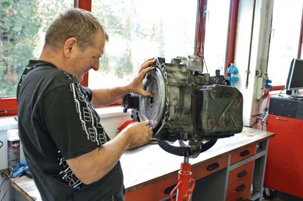 A kettős tömegű lendkerék cseréje elég nagy munka, lényegében egész napos szerelést igényel. Ki kell venni a sebességváltót, ehhez pedig le kell kötni a féltengelyeket, tehát bontani a futóművet. Modelltől függően a motort is el kell mozdítani a helyéről – emelni, süllyeszteni. Az Octavia esetében sem volt ez másképp, egy délelőttön át nőtt az autó melletti kiszerelt alkatrészek kupaca. A váltó kiemelése is különleges figyelmet igényel, ráadásul a DSG (és egyéb automaták) nagy tömege miatt kétemberes a feladat. Esetünkben a vizsgálata igazolta a hibafeltárás feltételezését, lötyögött, kopogott az alkatrész. A következő feladat volt a cseredarab összehasonlítása a régivel. A jól csengő nevű Sachstól származott az alkatrész, amelyet nem meglepő módon Kínában gyártottak. De méretpontos volt, és mára túl van 4000 km megtételén. A beszerelés előtt a méretösszevetés mellett a szerelők belepróbálták a váltóoldalba is. Minden rendben volt, így kezdődhetett az összeszerelés. Előbb a lendkerék felcsavarozása a motorra, majd a váltó visszaemelése, rögzítése, ezt követően a féltengelyek bekötése, a futómű összerakása és az alkatrészek, burkolatok visszaszerelése.