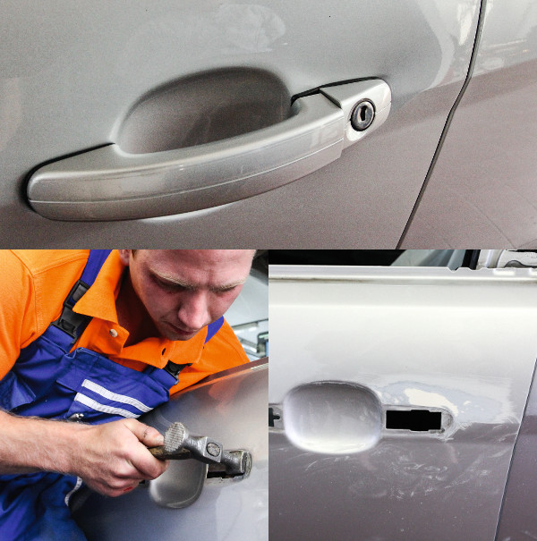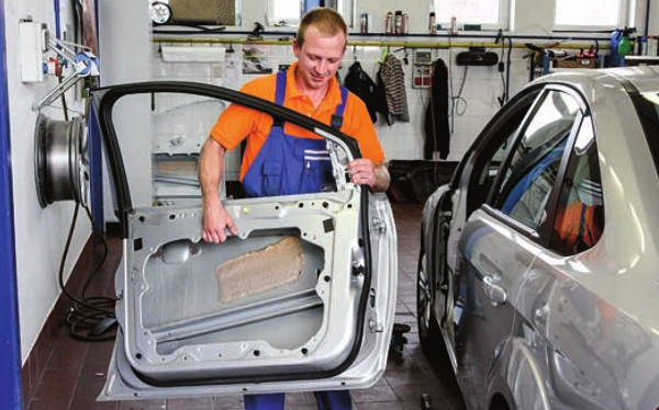 A zárat feszegetve behorpasztották a lemezt, az ajtó szétszerelése után hagyományos lemezmunkával javították a horpadást. A karosszériásoktól így került a fényezőkhöz az ajtó. Kezdődhet a kozmetika! A cikkünkben szereplő kocsit megpróbálták feltörni, a zár feszegetésekor pedig behorpadt az ajtólemez is. A javításhoz levették a kárpitot, kiszerelték a kilincset, majd egyengetéssel javították a kilincs körüli lemezsérülést. Ezután lecsiszolták a javított részt, majd leszerelték az ajtót és elvitték a fényezőműhelybe. Ott az egész ajtót előkészítették fényezésre, csiszolták, zsírtalanították. A munkafázis része, hogy ha peremezett részt, vagy hegesztési varratot is érintett a javítás, az esetben a varratvédelemről is gondoskodni kell. Az elemfényezés egyébként azért is bevett eljárás, mert az egyszerűbbnek tűnő foltjavítással is közel ugyanannyi a munka, és nem feltétlenül olyan szép a végeredmény. Foltjavítást olyan elemeken alkalmaznak, amelyek nem leszerelhetők, nem elkülönülők, mint például a tetőoszlopok, a hátsó sárvédők, vagy a kasztnihátfalak.
