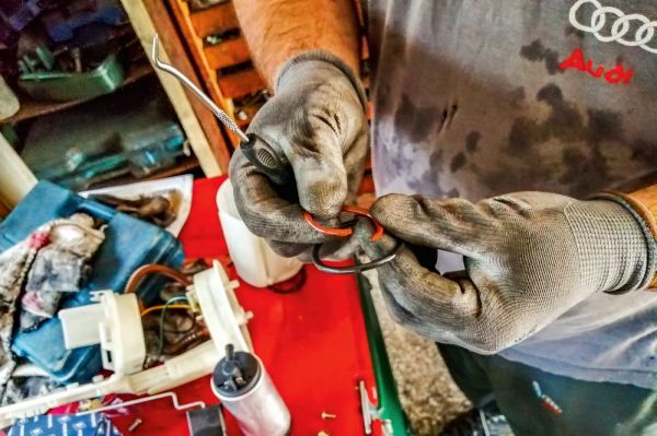 Másnap begördült a kocsi a szokásos köszörüléses reggeli indítás után a szervizbe. Az új Pierburg üzemanyagpumpa már várta, a beépítést. A szakember szabaddá tette annak szerelőnyílását, amely – mivel tankon belüli pumpa – a csomagtér mélyén van. Ezt kényelmesebben elérni az utastér felől, a hátsó ülés lehajtásával lehet. Leszedte a takarólemezt, lekötötte a vezetékeket, majd lecsavarta a pumpát rögzítő menetes gyűrűt. Kiemelte a teljes műanyag pumpaházat, kifolyatta belőle a benzint, majd a szerkezet felkerült a munkaasztalra. Kiemelte a tényleg újszerű pumpát, és akkor derült ki a hibajelenség valódi oka. A pumpa alatti O-gyűrű elnyíródott, a tömítés pedig itt átengedte a benzint, a pumpaházból is rendellenesen lement az üzemanyagszint, és a reggeli indításokhoz is nehezen épült fel a szükséges nyomás.