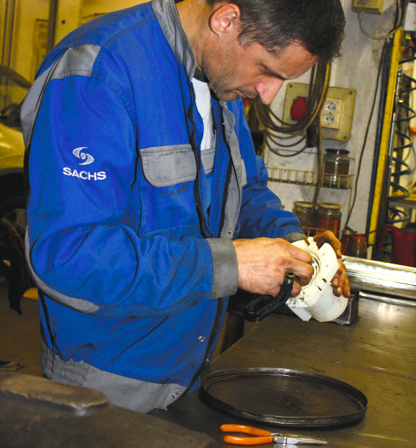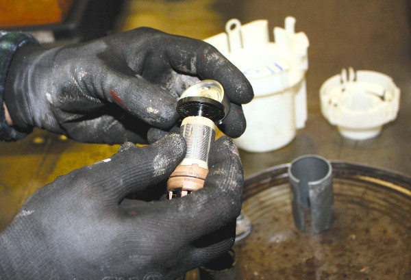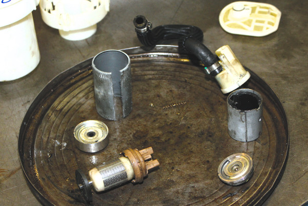 Sajnos a modern üzemanyagpumpák már nem szétszerelhetők – ritka kivételtől eltekintve. A műanyag ház még leszedhető roncsolás mentesen, de a villanymotor és a rászerelt lapátozás már egy közös fémházban dolgozik, amelynek a végeit peremezik. Mivel egy viszonylag vastagabb anyagról van szó, a peremezés felől sem lehet sérülésmentesen megnyitni a fémhüvelyt. Így flexszel felvágtuk óvatosan a ház oldalát. Ekképp felszabadultak az alkatrészek, a hajtómotor, mellette a kétrészes szivattyú, benne a lapátozással. Rendkívül egyszerű szerkezet. A hiba azonnal észrevehető volt, a kis műanyag lapátsor ráragadt a szivattyúház felületére, mintha valaki finoman és egyenletesen zöldes barna ragasztóval kente volna be. Elméletileg a ragacsos anyag eltávolítása után, a pumpát összeszerelve vígan dolgozhatott volna még, de a gyári, nem szerelhető kialakítás miatt ezt nem tehették meg. Végső esetben például egy új ház esztergálásával és menetes fedőlapokkal meg lehetett volna oldani, hogy visszakerüljön, de ehhez még a nagy, fehér műanyag házat is át kellett volna alakítani. Olyan munkák ezek, amelyeket csak ritka, különleges autóknál érdemes elvégezni, ahol az alkatrészellátás már nem biztosított.