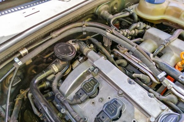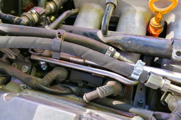 Esetünkben már megvásárláskor javítgatott volt a tűzfal felőli szakasz a betápláló csőnél, és szivárgott a benzinhídnál. Emiatt májusban az aktuális szaki leszerelte a gyári gumicsövet, majd egy 8 mm-es utángyártott csővel pótolta, amelyet mindkét oldalon bilinccsel rögzített. Szépséghiba, hogy az alumíniumcsőből annyi letört már, hogy az nem rögzíthető a gyári módon a tűzfalhoz. Elméletileg ezeknek a benzincsöveknek bírniuk kéne a hőterhelést is, hiszen jellemzően a motorhoz közel helyezkednek el. Valamiért ezekben az autókban mégsem bírják. Nem ez az első tapasztalat, hogy nagyon hamar kirepedeznek: esetünkben 4 hónap és kb. 8000 km kellett hozzá. A cső a szelepfedél magasságában fut, a motorburkolat alatt, a trafó cserélésekor tűnt fel az aggasztó állapot. Eldöntöttem, hogy nem cserélem a szokásos „konfekció” benzincsőre (korábban több márkát kipróbáltam, mindnek megrepedezett a palástja). Felhívtam például VW márkaszervizt, hátha kapható gyári alkatrész. Segítőkészen kikutatták a cikkszámot, majd elmondták, hogy csak a tanktól volt rendelhető a teljes cső, párban, tehát az oda- és a visszaág egy csomagban, de már nem gyártják. Az utolsó ismert ára 2012-ben 110 000 Ft magasságában volt: nem hiszem, hogy sokan vásárolták, mert szinte minden B5-ös Passaton és kortárs Audikon, amelyekben 1.8T motor dolgozik, csak a maszek csőtoldásokat láttam. A korábbi ilyen autómon egy 12 cm-es csőszakaszt kellett pótolnom, mindig repedezett, így 2 havonta cserélgettem, amíg el nem untam, és a leszedett darabot hosszában felvágtam, hogy lássam, belül milyen állapotú a kívülről ijesztő állapotú cső. Nos, belül jó volt, így onnantól kezdve nem cseréltem.