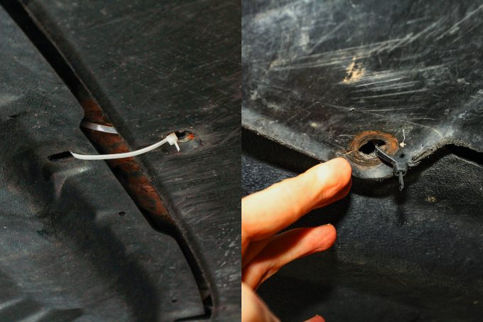 A gyors szemle megnyugtató volt, és kijelölte a feladatokat. Szerencsére a fényszóró épen maradt, a hűtő sem sérült, a lökhárító a karcoktól eltekintve nem szenvedett maradandó alakváltozást, de a rácsok fülei letörtek. A ködlámpa berepedt, a haspajzs rögzítőinek fele letört, a maradék átszakadt, az egész hátracsúszott a sérülés oldalán jó 12 cm-rel, s a hátsó tartólemez is deformálódott. A dobbetét rögzítései elöl eltörtek, és a betét kiugrott a helyéről. Távol a világtól a józan autós magára számíthat. Pár lemezcsavart sikerült összeszedni a csomagtartó zugaiból, meg a haspajzs megmaradtjaiból, és szerszámnak volt egy csavarhúzó meg egy univerzális „backtool”. Séta a helyi háztartási boltba, ott lemezcsavar helyett facsavar volt, és bekerült a zacskóba még egy csomag kábelkötegelő is. A fáskamrából egy elfűrészelt gerenda lett a „csápos emelő”, a jobb első kerékkel ráállva. A többi kerék kiékelve, a kocsi meglökdösve, hogy stabilan áll-e, majd jöhetett a javítás, amely elsőként a haspajzs helyrerángatásából állt. Ezután már nem volt útban, vissza lehetett pattintani a dobbetétet, a helyére nyomni a lökhárítót – szerencsére annak a rögzítője csak szétugrott, nem tört. Következett a haspajzs rögzítése. Elöl a kötegelők lettek átfűzve a patentfuratok helyén – azok kiszakadtak. Így már nem lógott le, majd jobboldalt – mivel a dobbetétről leszakadt – a haspajzsrögzítő furatok környékén is a facsavarokhoz kellett folyamodni. Óvatosan szabadott buherálni, mert a belső oldalon futnak a légkondicionáló visszatérő csövei. A haspajzs-dobbetét kérdés megoldva, a funkcióját ellátja, nem szép a rögzítés, de senki nem látja. A megmentett fekete fejű lemezcsavarokkal a középső lökhárítórács két helyen (ez deformálódott, a fül mellett elszakadt, de a fül megmaradt), a ködlámpa körüli rács (eltekeredett, a rögzítőfülei letörtek) három helyen lett odacsavarozva, azért így, hogy ne legyen túl feltűnő. A végeredmény kielégítő lett, pár méterről nézve fel sem tűnt a sérülés, közelebbről is inkább csak az autókat ismerők vehették észre.