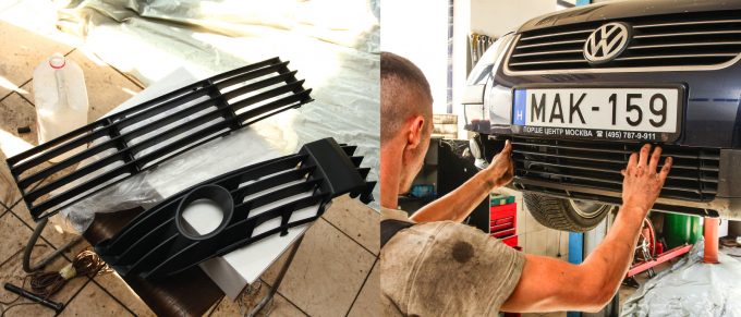 Persze a kocsi nem maradhat ilyen szedett-vedett. Szerencsére olyan korú és gyakoriságú az autó, hogy nagy az alkatrészkínálat. A haspajzs nem drága, de a rögzítő tartozékok (patentek, lemezek) igen, mert csak gyári kapható. Így egy új haspajzs 10 000 forintját 35 ezerrel kéne megfejelni, hogy hiperkorrekt legyen az eredmény. Minthogy ebből a nézetből csak a szerelő látja az autót, maradt a kötegelős rögzítés, a felcsapó víztől így is véd. A rácsok olcsók: a középső és a bal szélső együtt sem került többe 5000 forintnál, így ezek felkerültek a helyükre. Máris jobb a helyzet. Kell még ködlámpa, bontóból lesz gyári, hogy ne legyen féloldalas a látvány. A lökhárítót bizony le kell majd fényezni, és igazán csereérett a koptató is, de az úgyis gyakorta sérül, amíg csak karcos, maradhat, segít majd rajta a műanyagápoló.