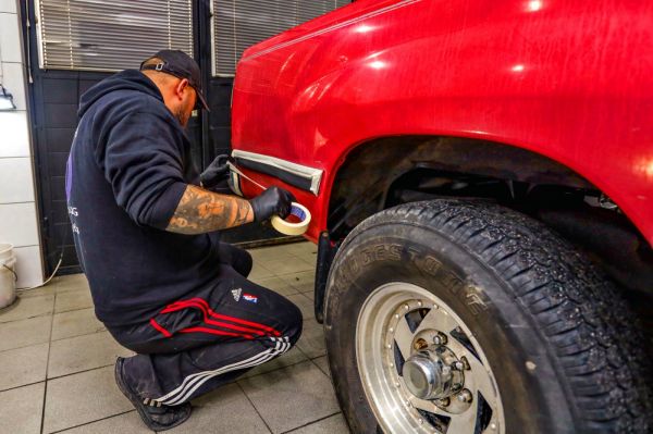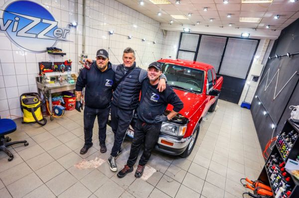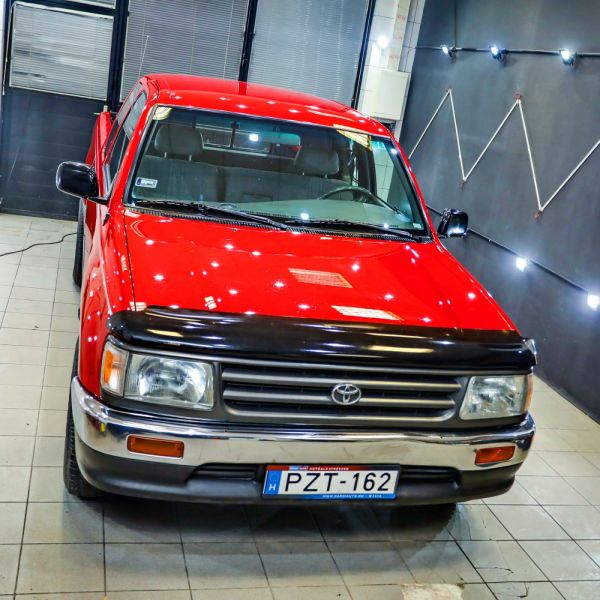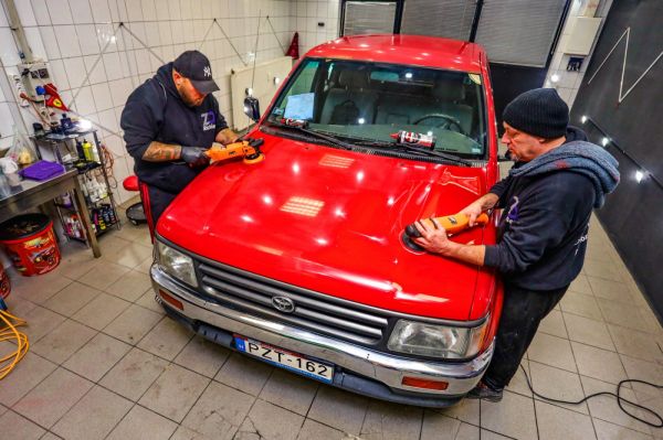A még az USA útjain is ritka Toyota T100-as pick-upon alapos állapotfelméréssel kezdődött a munka. Egyrészt az eredeti szín megállapításával, amelyhez a takart felületek (falcokban, matricák alatt) adtak támpontot. A nagy nézelődés közben a kocsi bevallotta az összes horpadását, a begyűjtött karcokat, a fura kifehéredett, felmaródott foltokat, amelyek eredeteként madárürüléket feltételeztek. Kérdéses volt, hogy a megkopott fehér vékony dizájncsík kibírja-e a polírozást, de a kocsi tulajdonosa le tudott mondani róla, ha úgy alakul. Mivel az autó elég nagy, a műhely előtti hely pedig zsúfolt, Jessevel kigurultunk egy közeli önkiszolgáló autómosóba gőzborotvával leveretni a kasztnit. Csengett az apró az automatába, Jesse pedig szépen körbeborotválta a kocsit – még több hibát feltárva.