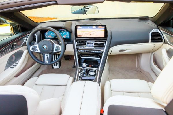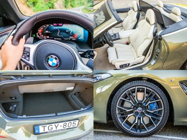 Bár az árlistában 340 lóerős 840d xDrive dízel és 625 lóerős M8 Competition változat is szerepel, az 530 lóerős, biturbó V8-as benzinmotorral felszerelt M850i xDrive karakterét tekintve arany középútnak nevezhető. Legendás, 1989-es elődjénél ugyan kevésbé jellegzetes, a szemnek mégis kellemes megjelenésű 8-as formatervén a 2022-es frissítés során keveset változtattak a bajorok, új lökhárítókat, fényezéseket és könnyűfém felniket kapott, még a legfeltűnőbbnek nevezhető elem, a megvilágított vese is csak sötétedés után tűnik fel. A tesztautó Motorsport logója az M divízió 50. évfordulóját ünnepli, a látványos Individual fényezés viszont már nem rendelhető. Mivel igazi élményautó, nem vitás, hogy megér 2 990 000 Ft-ot a nyitható tető, a nekünk tetsző 20 colos felnikért a megújult V8-asoknál úgysem kell felárat fizetni, egyébként háromféle Merino bőrkárpit is alapáron jár. A feketével kombinált elefántcsont színű belsővel éppen olyan exkluzív ez az összeállítás, ahogy egy több mint 50 milliós autótól elvárjuk…