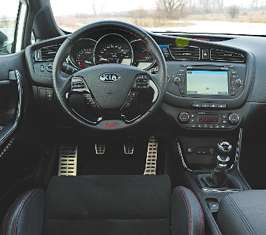 A GT-kivitel három- (pro), vagy ötajtós kasztnival konfigurálható, szimpatikus húzás, hogy utóbbi nem feláras. Mondani sem kell, hogy az ötajtós mennyivel praktikusabb. A pro ceed hosszú első ajtóinak kitárásához óriási helyre van szükség, a hátra történő bejutáshoz ráadásul elég szűk a rendelkezésre álló rés. A bosszúságok csúcsát azonban a memóriafunkció nélküli első ülések jelentik, az utasok beszállása után mindig állítgatni kell a sportfoteleket. A kabin gusztusos, kellemes formák, a legtöbb helyen pedig jó tapintású anyagok veszik körbe az elöl ülőket. A navigáció grafikája igényes, a címbevitel egyszerű, az adatbázisa is rendben, csak épp a magyar nyelvű kezelhetőség hiányzik. A többlépcsős fedélzeti menüben a kormányra helyezett gombokkal nehézkesen lehet barangolni.
