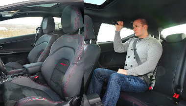 Van oldaltartásuk, ugyanakkor nem szűkek a Recaro sportülések, a deréktámasz elektromosan állítható. Háromajtós mércével egészen normális a hátsó hely, de az összeszűkülő oldalablakok rontják a térérzetet