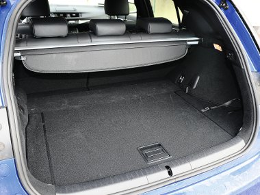 Belül a fekete színű, kontrasztos fehér varrású, perforált bőrkárpittal (a kormányra és a műszeregység árnyékolójára is jutott belőle), fekete tetőkárpittal és alumíniumpedálokkal igyekeztek sportos hangulatot teremteni. Mivel a sötét színvilág vizuálisan szűkíti a teret, így még jobban feltűnik, hogy milyen passzentos a helykínálat. Az F-Sport felszereltsége már nagyvonalúnak mondható, modern vezetéstámogató kütyük viszont felárért sem rendelhetők.