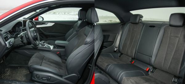Az ingolstadtiak az evolúcióban hisznek, ritkán nyúlnak a dizájnhoz, a második A5-ösnél viszont merészebbek voltak a szokásosnál, apró, de feltűnő pontokon változtattak az A4-esen, hogy saját karaktere legyen. Hatásos, mégsem hivalkodó, elegáns, mégsem konzervatív, még a piros is jól áll neki, olyan sportossá teszi, mint elődeit. Hosszú ajtaján át az elmúlt időszakban megszokott, pazar belsőbe jutunk. A kiváló minőségű anyagokból felépített, hűvös elegancia a márka védjegyévé vált. Az A4-esével gyakorlatilag megegyező kialakítás ebben az autóban is megállja a helyét, a sötét bőrbelső valódi alumíniumbetétekkel talán sosem megy ki a divatból. Kupéként a legfontosabb különbség a távolra kerülő övet előretoló pálca, minden más ismerős a korábbi tesztautókból: az ergonómia példás, minden szigorúan minőségi hatást keltve kattan, fordul vagy billen, egyedül a tárolóhelyekkel bántak szűkmarkúan. Nem csalódtunk a sportülés komfortjában és tartásában, ahogy a második sor kényelmében sem. Bár szűkös a hely, aki ott elfér, élvezni fogja az utazást. Mert az A5-ös kiváló eszköz akár egy kis adrenalinfröccsre, akár pihentető helyváltoztatásra vágyunk. Az Audi nem az intenzív vezetési élményben hisz, maga a kifinomult kezelhetőség és az impresszív menettulajdonságok miatt öröm vele minden egyes kilométer.