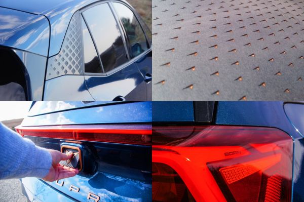 Szemmel láthatóan az ID.3-as testvérmodellje a Born villanyautó, de egyedi a külső a gonosz tekintetű fényszórókkal és, a Cupra-sajátosságnak számító rézdíszekkel, amelyeket kiemel az Aurora-kék fényezés (362 220 Ft). Bent is egyértelmű a rokonság a kezelőszervek miatt, de a műszerfal rézszínű cérnával öltött díszvarrásával és a gránitszürke Dinamica kárpit résein átvillanó rézszínű alsó szövettel sokkal minőségibb a benyomás; persze ehhez meg kell venni a masszázsfunkciós első kagylóüléseket is (689 610 Ft). Az igazán sportos vezetési pozícióhoz a padlóhoz képest magasan van az ülőlap, amit igazából nem itt érezni, hanem a második sorban, ahol bizony a fejtér mérete szűk.
