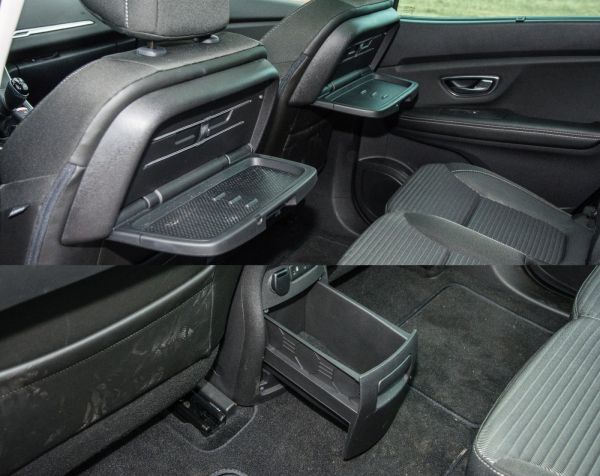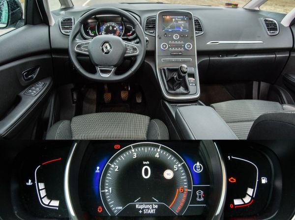 A vezetői környezetben semmi meglepetés nincs, a Megane-ból ismert elrendezés fogad, az ujjlenyomatgyűjtő középkonzollal, amely a nagy, tabletszerű érintőképernyő ellenére sem kelt értékes hatást. Igazából sokkal nagyobb probléma, hogy lassan reagál a parancsokra, és a menü struktúrája sem feltétlenül logikus. Még szerencse, hogy a hőfokszabályozásnak meghagyták a tekerőgombokat… Azt meg kell hagyni, hogy rekeszből nincs hiány, itt nem lesz olyan probléma, hogy nincs hova tenni a telefont vagy az üdítőspalackot. Piros pont jár azért, hogy a Renault visszahozta a Scenic II-es csúsztatható, középkonzoli tárolóját, ami nagyon hasznos lehet. Említésre méltó a fiókos kesztyűtartó is, ami sokkal több holmit tud befogadni, mint a hagyományosok. Hátránya is van azért, mert a nyitásához jókora hely kell, ha valaki ül az anyósülésen, bizony nem egyszerű művelet.