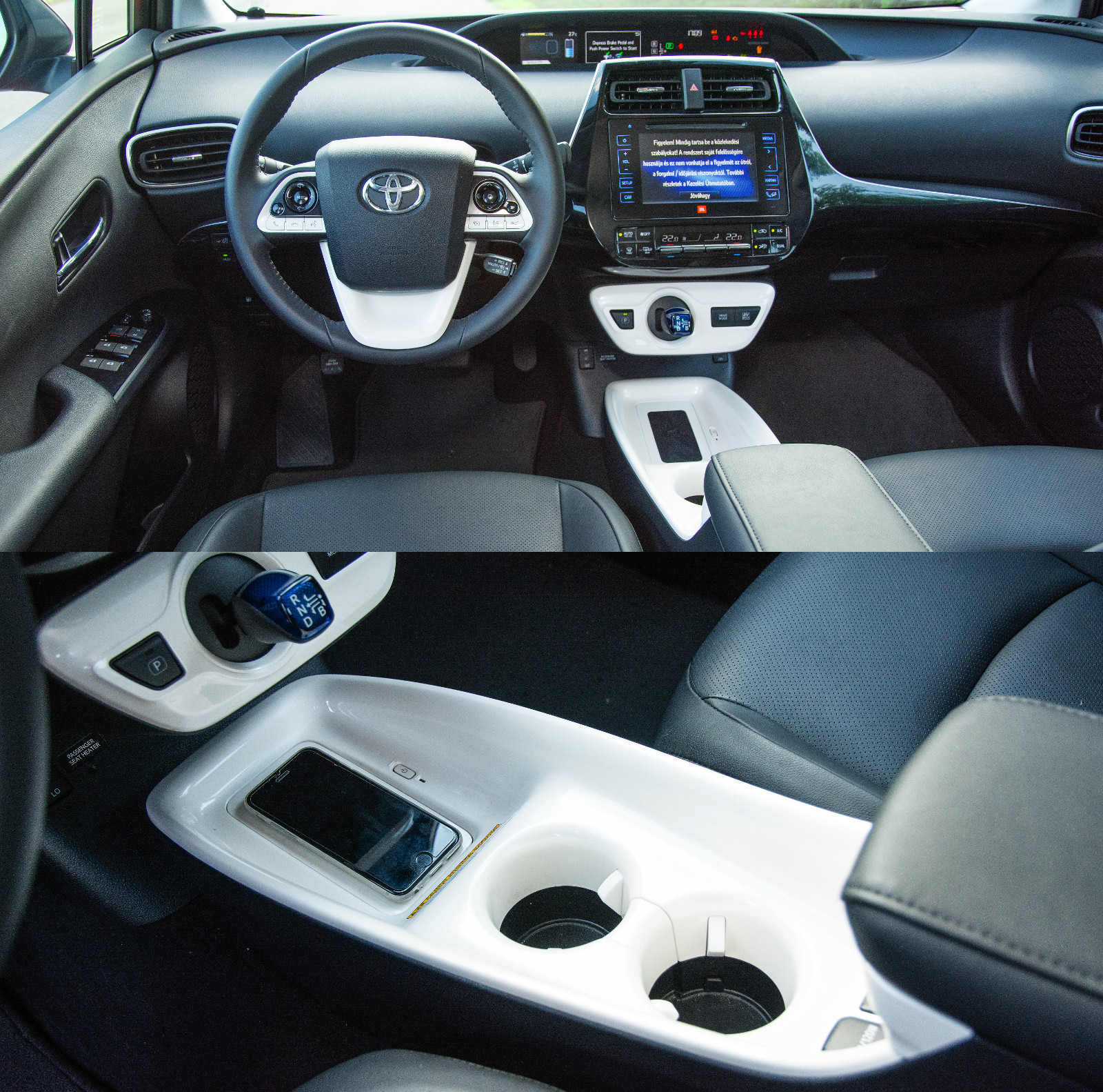 Rögtön feltűnik, hogy mennyit javult a vezetési pozíció, alacsonyabban, sportosabb szögben ülünk a kormánynál, és tágasabbnak is érezzük a teret. Amerikai piacra méretezett belseje légies, hátul is bőséges a helykínálat. Rolóval lefedett csomagtartójába is kényelmesebben pakolhatunk az alacsonyabb padló miatt (itthon csak defektjavítóval kapható az autó). Továbbra is futurisztikus benyomást tesz a műszerfal, nem csoda, hiszen az utolsó csavarig új. A fürdőszobai szettre emlékeztető, fényes, fehér műanyag betétektől eltekintve a korábbinál jobb az anyagminőség, és még több ötletes, valamint praktikus részletet szórtak el odabent. Kényelmesek az ülések, ergonomikus a belső, könnyű eligazodni a középkonzol érintős és fizikai gombjai között, az irányváltó kar is ideális helyen van. Rímel az elődökére a középre rendezett műszerfal, könnyen leolvasható a digitális kijelző, annyira, hogy a nem sokkal mellette lévő HUD szinte feleslegessé válik. Lehet érezni a Prius dimenzióit, előre és oldalra jó a kilátás, vékonyak az A-oszlopok. Hátrafelé már nem olyan könnyű kilátni belőle. Nehezíti a belső visszapillantó használatát a képet kettévágó osztás a hátsó ablakban, ráadásul kétféle színezést használnak az üvegek hővédelmére, ez észrevehető a tükörbe nézve is. Tolatásnál jól jön a kamera éles képe, de nagyon zavaró a parkolóradar jelzéseitől független „vészjelző” csipogás.
