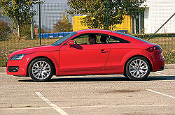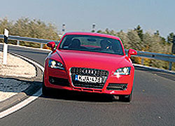 Az Audi kanyarokban is magabiztosan fogja az utat, nagy tempónál az orra finoman kúszik az ív külseje felé, ami óvatos gázelvétellel korrigálható. Viselkedése jóindulatú, csak durva vezetői hibák térítik ki a béketűréséből. Tesztautónkat a 348 ezer forintos Magnetic Ride futóművel szerelték fel. Gombnyomásra kétféle „hangolás” választható: normál és sportos. Előbbi esetben a TT majdnem olyan komfortos, mint egy VW Golf, tudomást sem vesz a legtöbb úthibáról. Ha aktiváljuk a sport üzemmódot, érezhetően feszesebb lesz a csillapítás, kanyarokban minimálisra csökken a karosszéria dőlése. (A változó viszkozitású folyadékkal töltött lengéscsillapítóban egy elektromágnes ezredmásodpercek alatt ráncba szedi a folyadékban úszkáló fémszemcséket, ezáltal a folyadék keményebbé válik.) Érzésem szerintem lehetne még radikálisabb, feszesebb a beállítás.