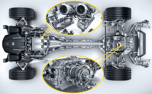 Mindezek ellenére szó sincs arról, hogy az AMG GT „csak” egy erős és hangos sportkocsi lenne, a márkától elvárható módon bőven találunk benne szofisztikált technikai megoldásokat. A hihetetlenül gyors gázreakciókról a hengersorok közé ékelt turbók, a megfelelő kenésről száraz karteres olajozás, a tökéletes súlyeloszlásról a hátsó tengelyre épített sebességváltó (transaxle-felépítés), a villámgyors megállásról pedig karbon-kerámia féktárcsák gondoskodnak. Ezekből az összetevőkből hihetetlen élményautót főztek ki az AMG boszorkánykonyhájában, a súlyeloszlás orrmotoros autó létére közel áll a tökéleteshez, szó sincs arról, hogy erős alulkormányzottsági hajlamtól szenvedne. Abban, hogy ennyire semleges a GT C Roadster, szerepet játszik az összkerékkormányzás is. A hátsó kerekek 100 km/óra alatt az elsőkkel ellentétes, afelett pedig azonos irányba mozdulnak el, emiatt elég egy kicsit mozdítani a kormányon és máris fordulni kezd az autó. S mi az, amiben lenne hova fejlődnie? A hétgangos DCT-váltó nem akkora durranás, a Getragtól érkező erőátvitel egyszerűen nem reagál gyorsan a kézi beavatkozásra, legalábbis a kemény sportkocsik szintjén biztosan nem. Annyi baj legyen, az AMG GT így is emlékezetes darab!