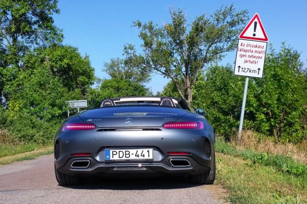 Az országúti tempó poroszkálás, alapjárat közelében duruzsol a V8-as, a fogyasztása 11,0 l/100 km-re esik vissza. Sztrádán is csak gyorsításkor halljuk vissza a gurgulázást, amelyet követően önkéntelenül is lelép az ember a gázról, hiszen jön a bónuszként értékelhető pattogós-durrogós szimfónia. A nagyjából 400 kilométeres túra során egyébként a bal lábammal nem tudtam mit kezdeni, úgy 100 kilométer után már szívesen változtattam volna a helyzetén, de erre egyszerűen nem volt lehetőség. Aki tehát túrázni indul az AMG GT C Roadsterrel, gyakori látogatója lesz a benzinkutaknak; nem elsősorban a tankolás okán, hanem hogy átmozgassa megmacskásodott lábát, és hogy hideg italt vásároljon.
