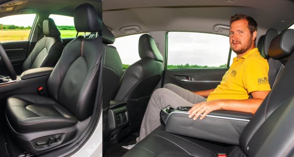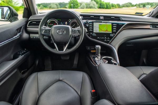 A TNGA-platformra épülő, nyolcadik generációs típus 4,9 méteres hosszával tekintélyes darab, de agresszív megjelenésről szó sincs, keveredik benne a japán és amerikai stílus – nem véletlenül, hiszen a Camry az Egyesült Államok egyik legnépszerűbb új autója hosszú évek óta. Ahogy beülünk, egyből feltűnik, hogy keskenyek az A-oszlopok, illetve hogy az alacsonyan lévő szélvédőperem és a nagy üvegfelületek miatt a térérzet és a körkilátás is elsőrangú. Az anyagok és az összeszerelési minőség is magas színvonalat képviselnek, és bár a középkonzolon végigfutó hullámvonalon látszik, hogy a dizájn sem volt utolsó szempont a tervezéskor, a klasszikus műszeregység és a csúszókulisszás előválasztó kar egyértelműen klasszikusnak hat a kategóriában megszokott digitális órák és joystickszerű váltók között.