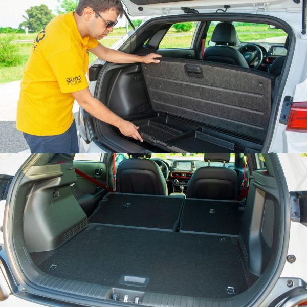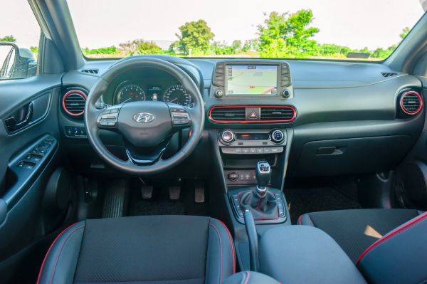 A kormány mögött ülve válik teljessé a kép, az eltalált üléspozíció és a jól átlátható karosszéria ügyesen aknázza ki a konstrukcióban rejlő lehetőségeket. Erre csak ráerősít a hosszú távon is kényelmes első ülés, melynek combtámasza anélkül is megfelelően hosszú és jól alátámasztja a lábakat, hogy bármelyik irányba állítható lenne. Hasonlóan átgondolt az ergonómia, ebben az ázsiai márkák hagyományosan jók, a Hyundai azonban a Volkswagen konszernre emlékeztető rutinnal és következetességgel tervezi az autóbelsőket. Logikus kezelhetősége, funkcionalitása, illetve nem túl nagy, cserében praktikus rekeszei is átgondolttá teszik az i30-ast idéző utasteret. Testvérére emlékeztet a letisztult és tárgyilagos elrendezés, illetve a döntően kemény műanyagokból álló, minőségi, kifejezetten tágas belső, de egyértelműen kisautós a kép. A Kona félúton jár a B és a C szegmens között, ez a magas padló alatti rekeszekkel szépítő csomagtéren is meglátszik.