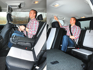 Az első ülések lapja kissé rövid, praktikus a számos rekesz, pohártartó és a jókora könyöklő alatt található hűtődoboz is. A második sorban igazán tágas a hely, itt is igényeinknek megfelelően szabályozható a szellőzés és az ülésfűtés intenzitása. Az ülőlapok sínen tologathatók, a támlák dőlésszöge is szabályozható, a plafonból pedig a multimédiás rendszer monitorja hajtható ki. A hátsó sori, elektromosan mozgatható üléseket az autó jobb oldaláról lehet csak megközelíteni, a férőhely egészen korrekt, a középső ülések előretolásával pedig a lábnak is elfogadható hely jut. A csomagtér a jobbra nyíló oldalajtón, vagy a külön, felfelé nyitható hátsó üvegen keresztül érhető el. A kitárt oldalajtó meredek lejtőn fixálható, a megerősített lökhárítóra fellépve pedig egyszerűen elérhető, pakolható a tetőcsomagtartó.