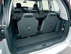 Hatalmas, sík lapokkal határolt az így nyert üreg, rakodását csupán az igényes padlószőnyeg nehezíti meg. Nem véletlen azonban a puha kárpit, a padlóból ugyanis további két ülés hajtogatható ki egyetlen könnyed mozdulattal. Ha utazásra nem is a legkényelmesebb hétüléses modell a C4 Picasso – erről leginkább a lábfejnek kimélyített, alulméretezett üreg tehet –, a beszállás egészen uras gyakorlat. A középső sor szélső elemeinek háttámlája ugyanis nem egyszerűen előredől, hanem automatikusan függőlegesbe emeli az ülőlapot, s azzal együtt egészen az első ülésekig csúszik. Az ötlet régi és jó, a kivitelezés szemrevaló és funkcionális.