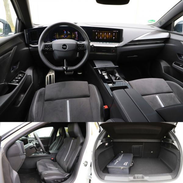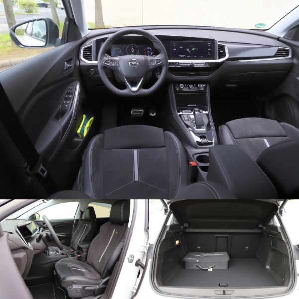 Érdekes párhuzam, hogy mind az Astra, mind pedig a Grandland tengelytávolsága 2675 mm, ennek ellenére igenis jelentős különbségek vannak az utastér helykínálatában. Ennek oka, hogy a majd 18 centivel alacsonyabb személyautóban a padlóhoz közel, előrenyújtott lábakkal ülünk, viszont a hátrébb lévő első ülések mögött nincs már elég hely a lábaknak – legfeljebb átlagos a térdhely, de a lábfejnek is alig van helye az első ülés alatt, és közel van a plafon is. Magas sofőrnek a bejutás is nehézkes, a kihúzott kormánykerék és a B-oszlop mögé tolt ülés miatt szűk helyen kell átcsusszanni. Közös panelben helyezik el a nagyméretű és éles képet mutató kijelzőket, a kezelést nehezíti, hogy nem jutott hely gyorselérést biztosító fizikai kapcsolóknak – legalább a szellőzésre gondoltak. A csomagtér mérete sokkal kisebb a csak belső égésű motorral felszerelt változatokénál.
