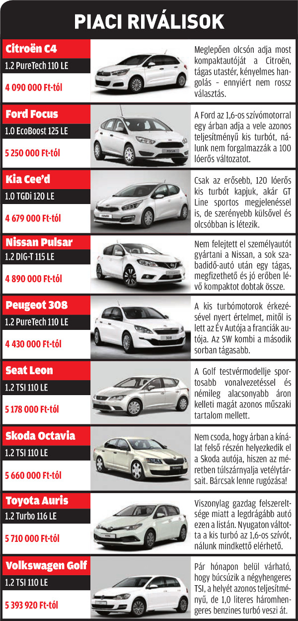 Az általunk is próbált, a Selection alapváltozat felett elhelyezkedő Enjoy szint 300 ezer forintos felára lényegében az IntelliLink 4.0 fejegységet hozza, illetve sok olyan extra van, amelyet csak itt érhetünk el, az alapváltozatnál nem. A következő lépcsőfok, a Dynamic szint már 600 ezer Ft felárat jelent, itt már megkapja az ember a vezetéstámogató csomagot (többek között sávelhagyás-figyelő, ráfutásos ütközést figyelő rendszer, koccanásgátló, táblafelismerő), automata fényszórókapcsolást, esőérzékelős ablaktörlőt, 17 colos könnyűfém felniket, de ezeket külön megrendelve az Enjoy szinten olcsóbban megússzuk a dolgot – a Dynamic szinttől azonban már rendelhetők azok a különleges felszerelések, amelyeket a bevezető kampányban is hangsúlyoznak. Ha az 1,0 literes, turbómotoros Astra árait a vetélytársakhoz hasonlítjuk (kompaktautó 1,0-1,2 literes turbómotorral, 105-125 LE teljesítménnyel, lásd a keretesben), akkor a kínálat közepén mozgunk, azonban az 1,4 literes, 125 lóerős turbómotorra váltva (20 ezer Ft felár), már olcsónak számít a német újdonság.