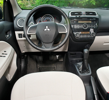 A Space Star utasterének kényelmes belakását időnként megnehezíti a kulcs nélküli bejutás, mivel csak a vezető- és a csomagtérajtón találunk nyitó-záró gombot, ezért ha az anyósülés ajtajánál kezdenénk a nyitást, használni kell a kulcsot, vagy tenni egy tiszteletkört valamelyik kapcsoló felé. A műszerfal kétszínű, megfejelve a feketére fényezett középkonzollal. Itt a rádió vonalbemenete, az USB-csatlakozót a kesztyűtartóba rejtették, de a fedél pereménél kihagyták a polcra helyezett eszköz kábelének helyét. Ezen felül még a váltókar előtt a padlón elhelyezett pohártartók és az ajtózsebek szolgálnak tárolóhelyként.