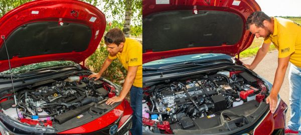 Új a Toyota kínálatában a 2,0 literes benzinmotort használó hibrid rendszer, amelyet kifejezetten a nagy teljesítményű dízelekhez szokott európai vásárlók „áttérítésére” készítettek. Műszakilag alapvetően ugyanaz a felépítés, mint a másik rendszernél, azonban nagyobb teljesítményű mind a benzin-, mind a villanymotor. A morgós motorhang illik a sportos hangulathoz, és a tempóval sincs baj. Ennél több fokozatban tudjuk állítani a motorféket úgy, hogy az előválasztó kart balra húzva a Sport mód aktiválódik, majd a virtuális fokozatok közötti ugrásokkal tudunk módosítani a hajtáslánc viselkedésén. Nekem bejött ez a megoldás. Az erősebb hibrid hajtással, a nagyobb teljesítmény kihasználásával 6,0 l/100 km lett a tesztátlag. Feltűnő, hogy az egyébként elképesztően csendes utastérben már városi tempónál is az abroncsot hallani, országúton már egyértelműen ez a legfőbb zajforrás – gyári szerelésű nyári abroncsokról beszélünk, a téli gumik hangosabbak! Határozott útfogást nyújt a felfüggesztés, miközben még a látványos, 18 colos felnivel is egészen jó a rugózási komfort, a fekvőrendőrökön is jól lépett át mindkét Corolla.
