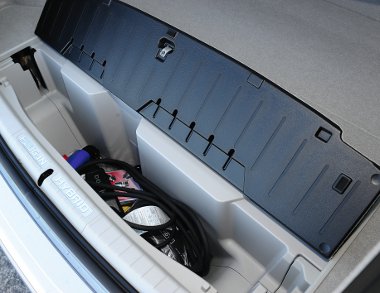 A hajtáslánchoz nem nyúltak, a Plug-in Prius esetén elektromos üzemmódban megfontolt teljesítményre képes – a menetpedál padlóig nyomására beindul a benzinmotor is –, de azért lehet tartani a forgalom ritmusát. Jó, hogy a csomagtér padlója alatti rekesz közvetlenül hátul van, és az egész, rendelkezésre álló szélességet elfoglalja – nem kell mindig felcsévélni a töltőkábelt, egyszerűen be tudjuk ide suvasztani úgy, hogy még a KRESZ-tartozékoknak is van helye.