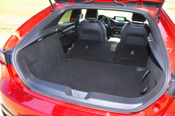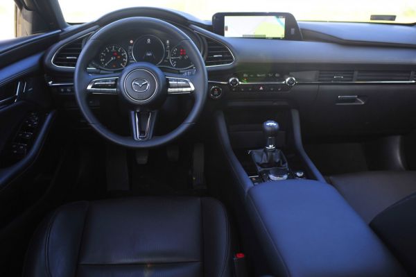 A parkolóban álló Mazda3-ashoz lépve vonzó látvány fogadja az embert, a többi közlekedő azonban nem így van ezzel: fenyegetőnek érzik a mögöttük közeledő autót. Amíg a lépcsőshátú a konzervatív vásárlóknak készül krómos hűtőráccsal és szürke belsővel, addig a tesztelt ötajtósnál fényes fekete betéttel díszítik a maszkot, amelyet szintén fekete hátterű, LED-es fényszórók kereteznek, ráadásul mivel cápaszerű a front kialakítása, legtöbbször a kocsi orra is árnyékban van. A visszapillantóban csak a nagy sötétségből kivillanó szúrófényeket látni, az emberek nem kockáztatnak, inkább lehúzódnak – nyugtató az ilyen zavartalan haladás. Nagy felületekkel, lágyan ívelt vonalakkal dolgoztak a formatervezők, amivel csak annyi a baj, hogy elképesztően vastagra sikeredett a hátsó oszlop, ami nélkülözhetetlenné teszi a radart és a kamerát – utóbbi csak a 450 000 Ft-os felárú Plus csomagban található meg. A lendületesen emelkedő övvonal miatt a hátsó oldalablakok parányiak és magasan vannak, a külsőhöz hasonlóan pedig itt is a fekete szín a meghatározó, ezért a második sorban bezártságérzése van az embernek – miközben a rendelkezésre álló hely átlagos. Az első sorban szó szerint jobbak a kilátások, hiszen nem spóroltak a csillogó krómmal és az ezüstös kapcsolókkal, és üde színfoltként itt van még a műszerpult falcából előbukkanó nagyméretű központi kijelző is.