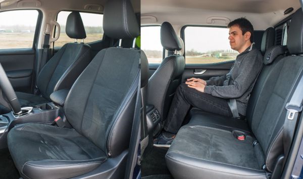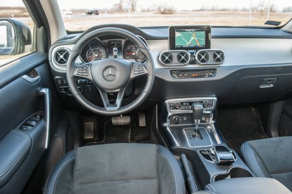 Személyautósnak néz ki a platódoboz által a sötétkék tesztautó, hiszen a fülke-plató közötti rés csak második pillantásra tűnik fel a szemlélőnek; olyan tekintélye van az X-osztálynak, mintha a sokkal drágább GLS-sel közlekednénk. Ránézésre ezt az illúziót az utastérben is tudja a platós kisteherautó, de ha megpróbálunk beülni, már érezhető az eltérés: az alváz miatt magasan van az utastér, kapaszkodó és a fellépő is segít a beülésben. Az üléspozíció pick-upos, azaz a padlóhoz közel, nyújtott lábbal ülünk az első sorban, hátul sajnos az ülőlap nagyon közel van a padlóhoz, így itt felhúzott lábbal kell utazni. A fejnek van elég helye, de például az én kobakom olyan magasan van, hogy a szemem az első szélvédő pereme felett volt, kifejezetten zavart, hogy csak 20 méternyire láttam a kocsi elé. A műszerfal a szálhúzott alumínium hatású betétje (nettó 27 560 Ft) miatt szellősnek hat, a középső kijelző a személyautók világában már kicsinek számít. A középkonzol alján található összkerékhajtás és lejtmeneti fékvezérlés kapcsoló árulkodik egyedül a nissanos rokonságról, minden más kapcsoló a Mercedes-Benz típusokból érkezik.