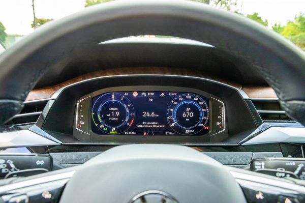 Miközben a navigációs adatokat is figyelő hajtásvezérlést csak dicséret illetheti, az üzemmódok közötti váltások, pontosabban a benzinmotor bekapcsolódása lehetne finomabb. Vélhetően a szerény lökettérfogat miatt a belső égésű egység magas fordulatra pörgetve száll be a hajtásba. A 7,8 másodperces 0-100 km/órás sprintidő viszont mutatja, hogy jó erőben van a hibrid változat, öt fővel, csomagokkal megpakolva is dinamikus, gázreakciója kifejezetten élénk. Az sem mellékes, hogy ha nem használjuk ki a hálózati töltés lehetőségét (3,6 kW-tal 3,5 óra alatt tölthetjük fel), akkor is 7,0-7,5 liter között tartható a fogyasztás, ami a 218 lóerő és a méretek fényében egyáltalán nem rossz. Persze a 17 190 870 Ft-os hibridet sokat kell hálózatra kapcsolni ahhoz, hogy a 200 lóerős, 2,0 literes TDI-hez viszonyított 2 milliós felárát behozza.