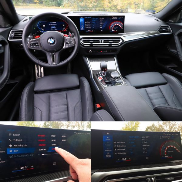 Nem spóroltak az elektronikus játékokkal sem a BMW M mérnökei, így az érintőképernyős menüben köridő-stoppert is találunk, de a keresztben autózásunkról is jelentést készít a Drift -mérő. Aztán itt vannak a beállítási lehetőségek, amely során nem csak a 8 fokozatú automatikus váltó dinamikáját tudjuk az ízlésünkhöz hangolni (mármint ha valaki nem a kormány mögötti kapcsolófülekkel akar játszani), hanem a megszokott motor- felfüggesztés- és kormányzás mellett a fékpedál (!) érzékenysége is kalibrálható. Utóbbi Sport állásban érzékenyebb lesz, tehát finomabb lábmunkát kíván a sofőrtől, illetve megköveteli a jól tapadó utat: fehér- vagy poros-kavicsos aszfalton nem megyünk sokra a szuperszéles Michelin abroncsokkal…