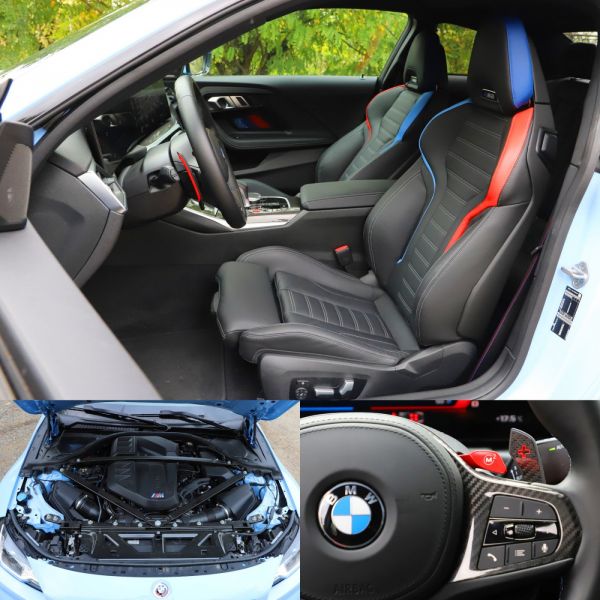 Nem hétköznapi látvány a tesztautó, és nem csak a retrós szín miatt. Az első lökhárító minimalista, téglalap alakú légbeömlők a meghatározók, a középen alul lévő érzékelőket feketére festve rejtik el. Különösen nagy púp kerül a motorháztetőre, hogy elférjen alatta a merevítések alá beszuszakolt 3,0 literes M-blokk. Technikai okokból is szükség volt a kiszélesített kerékjáratokra, amelynek kivitelezése piros pontot érdemel, hátul vitát nem tűrő befejezést látunk a 4 darab hatalmas kipufogóval. Világos karosszéria mellett jól néz ki az M Carbon tető (995 500 Ft), de értelme, mármint a pár kg-os tömegcsökkentés megkérdőjelezhető annak tudatában, hogy kényelmi felszerelésekkel teletömött utcai autóról van szó. Belül is lebilincselő a látvány, a „Vernasca bőrkárpit Fekete/exkluzív kiemeléssel” önmagában 114 900 Ft-os extra, de kötelezően rendelendő extrákkal összesen 857 800 Ft-ot fizetünk a kék-piros díszítésű sportülésekért, a karbon belső díszek 379 100 Ft-ba kerülnek. Ennél többet nem nagyon lehet kívánni – és kérni, hiszen az extralista véges.