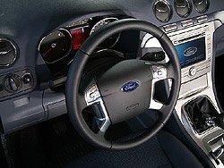 A Galaxy térkínálata ennek megfelelően hátul sokkal szellősebb. Legnagyobb meglepetésemre kollegám mögött, az utolsó sorban is kényelmesen elfértem, tehát a sajtóanyag nem túloz, miszerint a szükségülések 1,8 méteres magasságig ajánlhatók. Annál is inkább, mert nemcsak a három, egyenrangú középső ülés, hanem – a kategóriában elsőként – a hátsók szintúgy sínen csúsztathatók előre-hátra, továbbá a támlák dőlésszöge is állítható. Hétszemélyes üzemmódban a csomagtartó mérete hozzávetőleg egy kompakt autóénak felel meg (308 liter), ha a teljes csapat motyóját nem is, azért néhány bőröndöt gond nélkül elnyel. Amennyiben ez kevésnek bizonyulna, úgy a támlák pofonegyszerűen ledönthetők, s pillanatok alatt 2325 literes, sík padlójú rakteret nyerhetünk. Belül elsősorban a dekorációs elemek és a középkonzol eltérő kialakítása hivatott megkülönböztetni a párost. Az aktív életmódra kihegyezett S-MAX alapvetően ötüléses, elöl határozottabb oldaltartást biztosító sportos fotelekkel. Variálhatóságban,