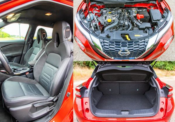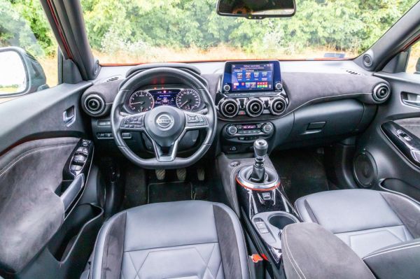 A 8,32 millió Ft-ba kerülő N-Design csúcsmodellnél a belső hangulat is sportos, bőven jut az Alcantarából a műszerfalra, az ajtókárpitra, a lábtámaszra és a könyöklőre, lakkfeketék a díszek. Viszonylag új modellről lévén szó meglepő, hogy bőven vannak fizikai kapcsolók a műszerfalon, nincs vetített műszeregység, miközben számos online szolgáltatást nyújt a Juke – a műszerfal tetejére került az érintőképernyős fejegység, ami nagyban megkönnyíti a használatát. A Renault alapra való átállásnak köszönhetően tágasabb a karosszéria, már a második sorban is kényelmesen el lehet férni, igaz, a nagyméretű első támla korlátozza az előre kilátást. A korábbinál öblösebb csomagtér jelentős része a padló alatt (egy fiók és az alatt a pótkerékmélyedés) található, és nagyobb méretű nyíláson férhetünk hozzá.