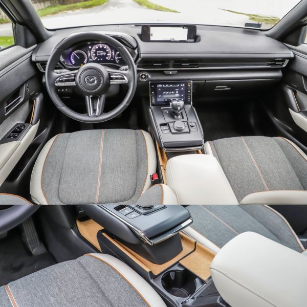 Ennek ellenére az utastér kifejezetten hangulatos, úgy passzol, mint egy méretre készített ruha, és olyan jól is érzi benne magát az ember. Ülései puhák, de van tartásuk, a vezetési pozíció ideális, a kormány igazi műremek, van a fejünk felett klasszikus tolótető, és ami felteszi a pontot az i-re, kanapékról ismerős, szürke kárpitozást kapott fehér bőrszegéllyel, melyek nagyon jól mutatnak a több helyen is megtalálható parafabetétekkel együtt. Ismét egy csokor ellentmondásos megoldás, hiszen otthonos környezetet kapunk, a használat során azonban meggyűlik majd a bajunk a tisztán tartásával. A berendezés döntő része más Mazdákból ismerős, öröm nézni a félig analóg, félig digitális műszeregységet, és jó látni, hogy bár a kifogástalan klímakonzolt egy érintőképernyőre cserélték, meghagyták a fizikai szabályozás lehetőségét is. Egyszerre érthető és meglepő, hogy hagyományos váltót, nem gombokat kapunk, hiszen csak az irányt kell kijelölni, és a kartól nehezebb elérni a már említett érintőpanelt. Ennél is furcsább, hogy miért volt szükség L alakú kulisszára, mert aki vezetett már automatikus váltóval felszerelt autót, könnyen hiheti azt, hogy P-be tolta a kart, pedig csak az R-ig jutott el, így rögzítés helyett akaratlanul hátramenetbe teszi az autót. Ha már szóba került a parkolás, elöl-hátul kamerák könnyítik meg a vezető dolgát, ezenkívül a kis fordulókör is nagy segítség.