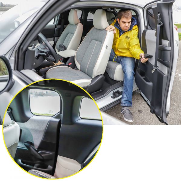 A belül elrejtett kilinccsel kinyitható ajtón át egy nehézkesen megközelíthető hátsó üléssorba jutunk, ahova a passzentos nyíláson át még be is kell hajtogatni magunkat. Átlagos testalkatú felnőttek ugyan jól elférnek, a vaskos oszlopok miatt csak repülőgépekről ismerős méretű ablakokon át lehet kinézni, a fejtér korlátozott, és az üléstámla is egy fokkal meredekebb, mint ami hosszú távon kényelmes lenne. Cserében megfelelő méretű a lábtér, és mindkét kezünknek jut kényelmes könyöklő. Kijutni sem egyszerű, bár egy kis nyújtózás árán el lehet érni az első kilincset, szűk parkolóhelyeken azért szükségünk lesz egy segítő kézre, legalábbis a fényezés épségének megőrzéséhez. Ez a szekrényajtós megoldás még mindig kényelmesebb, mintha csak az első ajtókon át kellene hátra mászni, de a szerkezet felépítése miatt hátrányokkal is jár. Az egyik a már említett korlátozott kilátás, ez sajnos az első ülésben ülve is nehézkesebbé teszi a manőverezést. Sem a vállunk felett, sem a túlsó oldalon nem könnyű kinézni, olyan érzés, mintha egy lemezelt furgont vezetnénk. A másik a fix B-oszlop hiánya, nagyobb úthibákon ugyanis recsegés hallatszik az ajtó felől. Ezenkívül magas orra is nehezíti a kilátást, benne ülve azt is elhinnénk, hogy egy hagyományos kupét állítottak gólyalábakra.