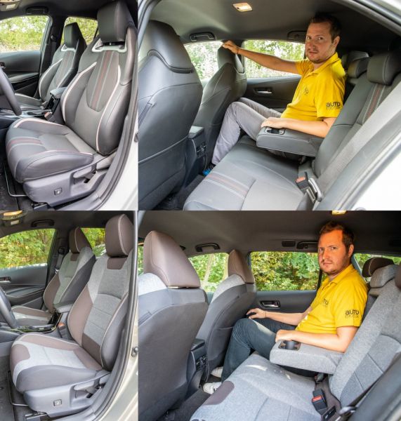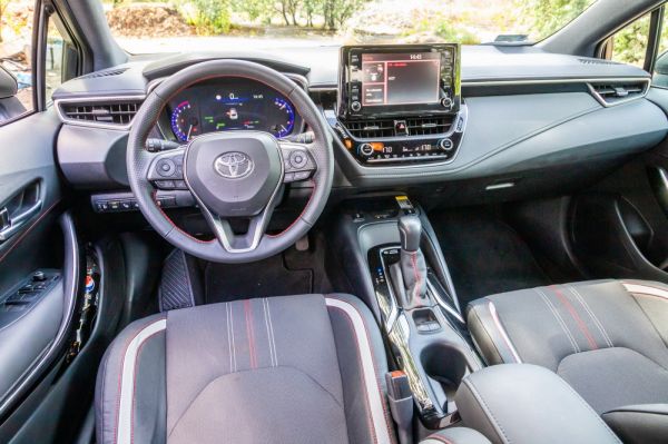 Éles vonalak jellemzik már alapból is a Corolla orrát, erre csak ráerősít a GR változat méhsejtmintás hűtőrácsa. A trendi pasztelszürke szín mellett karcsúsítja a megjelenést a fekete tető, a kerékjáratokat esztergált felületű 18 colos felnik töltik meg – utóbbi a Dynamic csomag (420 000 Ft) hozománya. Szemrevaló a látvány, amit a sportülés és annak kárpitozása is hangsúlyoz. Már korábban megismerkedtünk a 2,0 literes benzinmotort használó öntöltő hibriddel, amely nagyon jól illik a Gazoo Racing gyári versenyistálló által készített atletikus körítéshez.