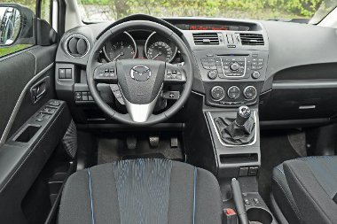 A kabin műanyagjai gusztusosak, de kemény felületűek, az áttekinthetőség első osztályú. A műszerfalon minden ott van, ahol ösztönösen keresnénk, igazából pontosan azt kapja a vevő, amire egy Mazdánál számít. Apró dolog, de zavaró, hogy a külső visszapillantó tükrök lapjai behajtás után – ez csak kézzel lehetséges, elektromos behajtási funkció nem érhető el – kissé elállítódnak, így azt minduntalan igazgatni kell. Hátra átlósan a kilátás nem az igazi, a tolatóradar erősen ajánlott tétel, azonban csak a középső, TX-szinttől konfigurálható. Aki beéri ötüléses dízel Mazda5-össel, az 6,14 millióért elviheti autóját, a hétfős változatért minimum 6,69 milliót kell leszurkolni.