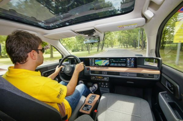 A márka korai slágercikkére, az első Civicre utaló formatervet semmivel sem lehet összetéveszteni. A Fiat 500-as ugyan hasonló karakter, a Honda e-vel inkább a high tech stílus felé mozdult el a külső formatervért felelős Ken Sahara, miközben a belsővel megbízott Akinori Myoui egy ma már szokatlanul otthonos hangulatot teremtett. A kamerákra cserélt külső tükröknek, a rejtett kilincseknek, a szinte egyforma első és hátsó lámpáknak, valamint a látványos töltőfedélnek köszönhetően jövőből érkezett tárgy benyomását kelti, viszont az ajtókat kinyitva egy régen alkalmazott megoldást, négy keret nélküli ablakot látunk. Odabent is ez a kettősség tűnik fel, hiszen a Civic fabetétes műszerfala újragondolt formában került bele. Összesen hat kijelzőn követhetjük a történéseket, ebből három a tükröké, hiszen a középső is digitális! Ez ugyan a vezető igénye szerint kikapcsolható, de ahogy néhány nap után már nem az ablak sarkában keressük a fizikai tükröket, hanem felfogjuk, hogy amit a monitoron látunk, az a valóság, úgy a hátsó ablak tetejére erősített kamera képét is meg lehet szokni, még ha valóban furcsa is ez a mozgóképet alapesetben videóként azonosító agy számára. A furgonok vagy egyterűek lemezelt hátfala, illetve tetőig pakolt csomagtartója esetén valóban hasznos kütyü ugyan egy a sok közül, de minél tovább vezetjük az elektromos Hondát, annál inkább magával ragad ez a japánokra jellemző, emberien modernizált világ.
